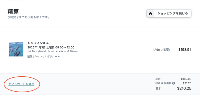 最後の精算画面です👇「ギフトカードを適用」をクリックし、ギフトガード番号を入力してください。合計金額に足りない場合は、差額をご自身のクレジットカードで支払えます。