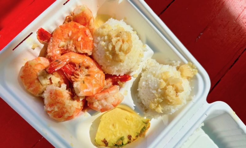 さて、そろそろランチタイムです。本日のメインフードです。ハワイに来たらこれは外せない「ガーリックシュリンプ」のプレートランチを食べます。大ぶりのエビをガーリックで炒めた料理は絶品です。是非、ハワイの人が愛してやまないローカルフードをお楽しみくださいませ。エビが食べられない人には、チキンカツ、または、ベジタリアン焼きそばもあります。