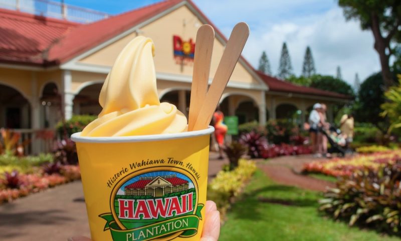 - ワイメアでハイキングを楽しんだ後は、パイナップルで有名なドールプランテーションに立ち寄ります。パイナップルソフトクリームがお勧めです。他にも、子供用の可愛いTシャツやぬいぐるみ、美味しいお菓子などのお土産もたくさん売っています。